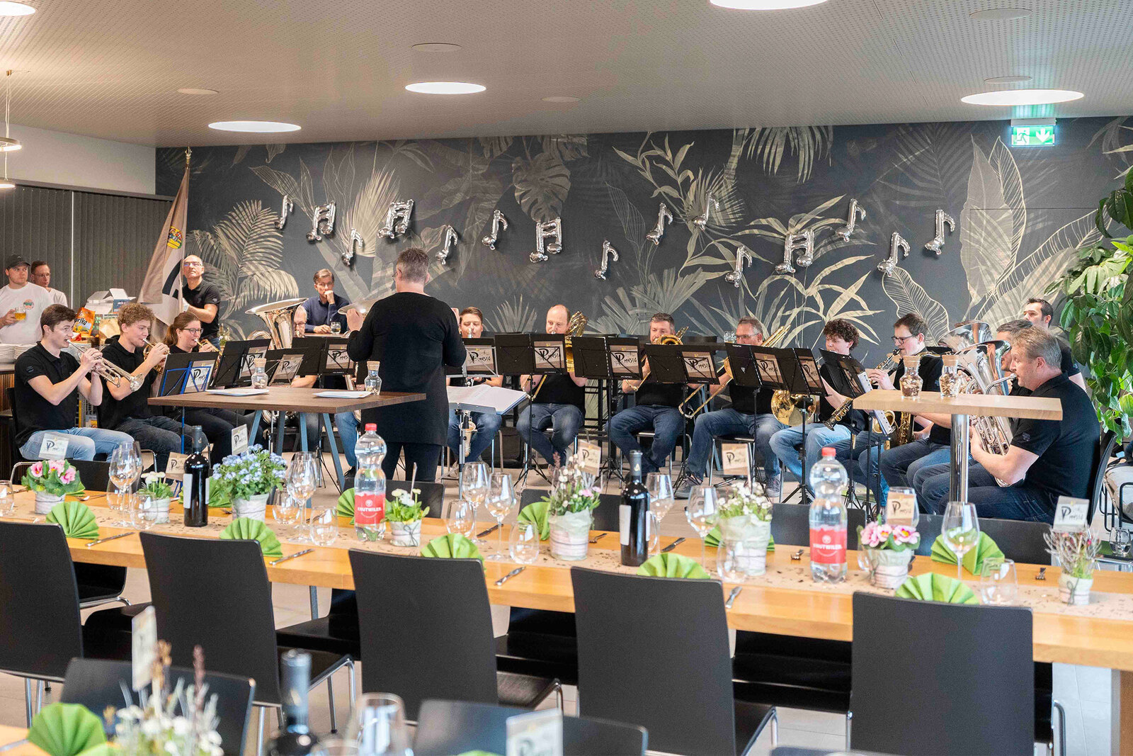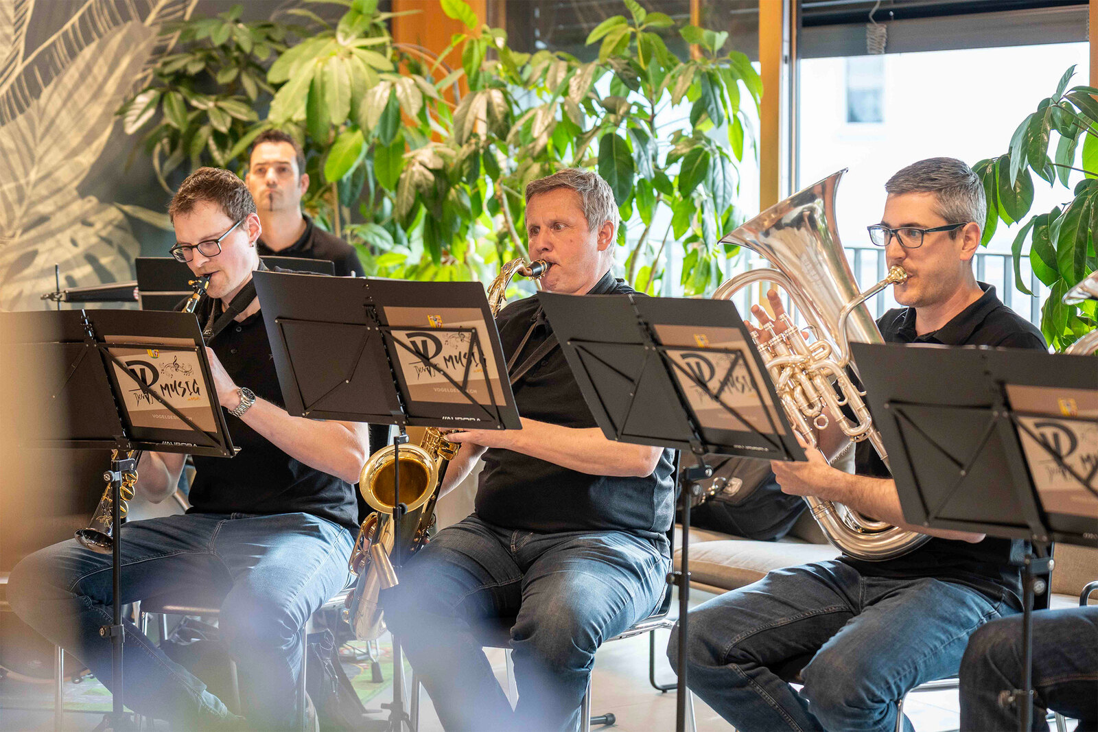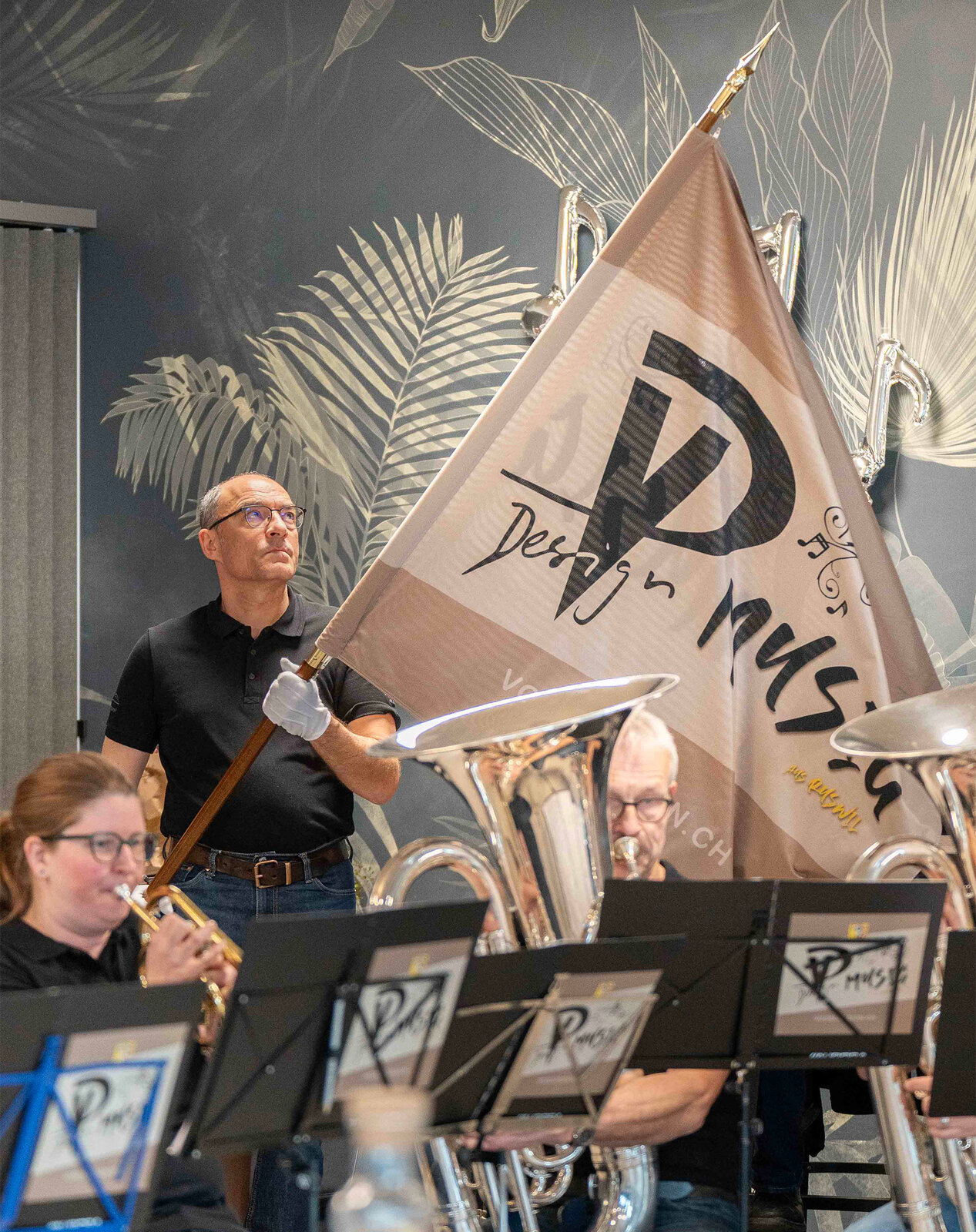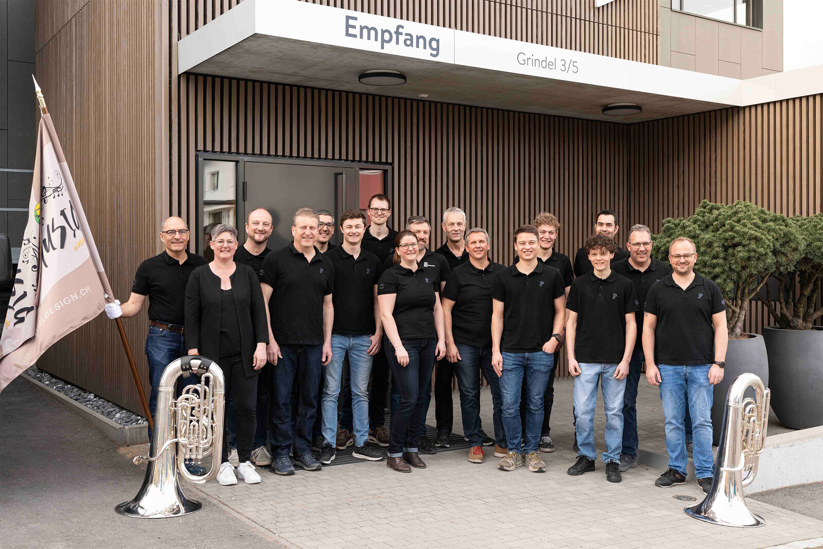 Nach der Premiere im Herbst 2024 an der RUGA folgten weitere Auftritte, unter anderem am Tag des Schweizer Holzes. Heute zählt die Formation 15 Musikantinnen und Musikanten – von Lernenden bis zu Mitarbeitenden aus Produktion, Büro und Montage der Vogel Design AG – ergänzt durch die Dirigentin Doris Muff und ihren Fähnrich Kurt Bachmann. Als eines der ersten Mitglieder der Formation war er bereits Fähnrich, als es die Fahne noch gar nicht gab.