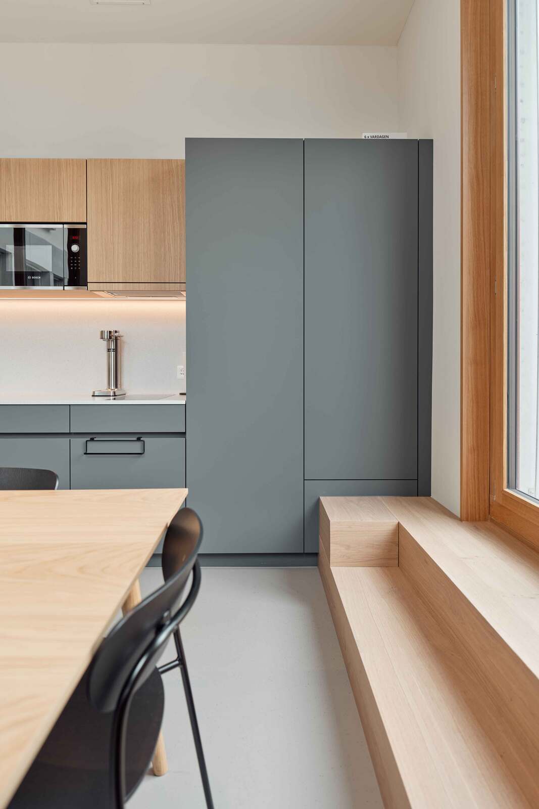 Die Türen und Schiebetüren sind aus Eichefurnier gefertigt und entweder leicht weisslich oder in Strukturlack farbig lackiert.