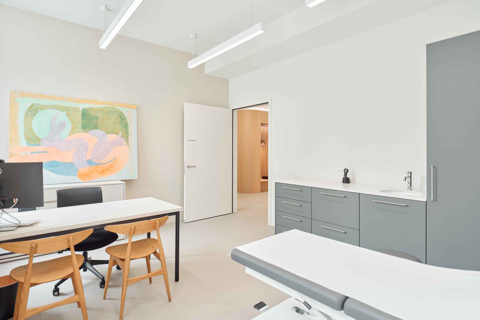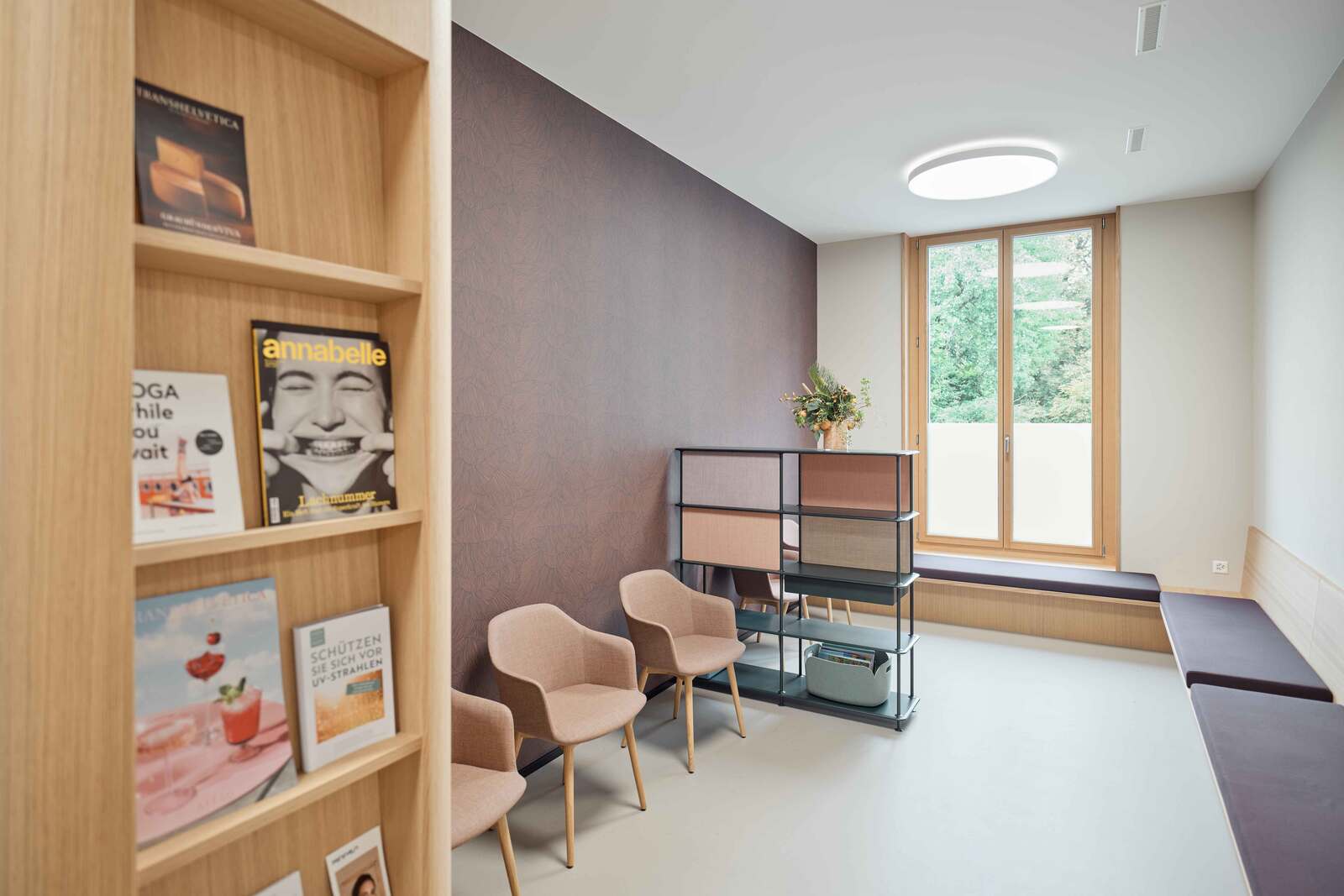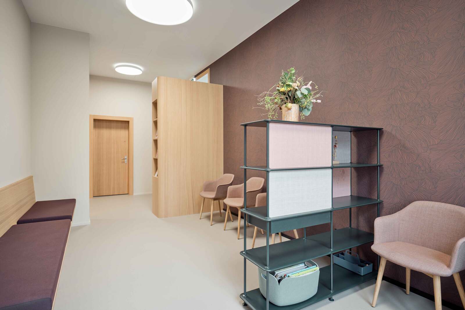 Die Fläche wurde im Edelrohbau übernommen und von der Vogel Design AG in Zusammenarbeit mit den Auftraggeberinnen von der Konzeptentwicklung bis zur Schlüsselübergabe begleitet und realisiert. Behandlungszimmer, Büros, Warte- und Aufenthaltsräume befinden sich bewusst an den lichtdurchfluteten Fassaden der Gewerbefläche, während die Nebenräume, die eine geringere Aufenthaltsdauer erfordern, im Kern des Grundrisses angeordnet sind. Wände, Boden, Decke und Einbaumöbel sind in einem stimmigen Farb- und Materialkonzept harmonisch aufeinander abgestimmt.