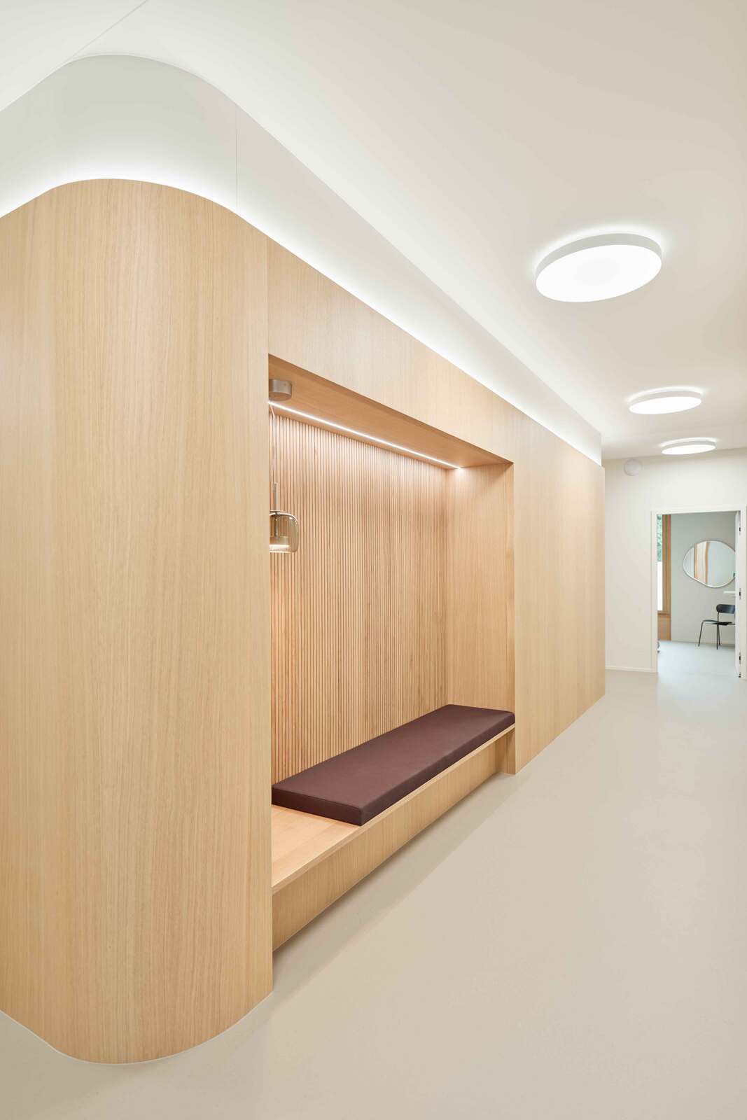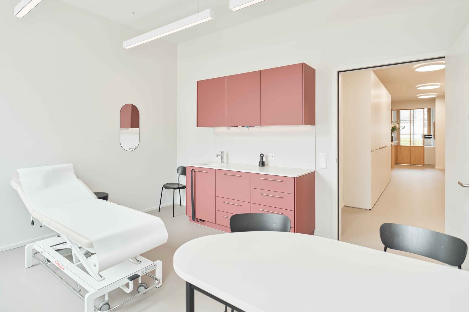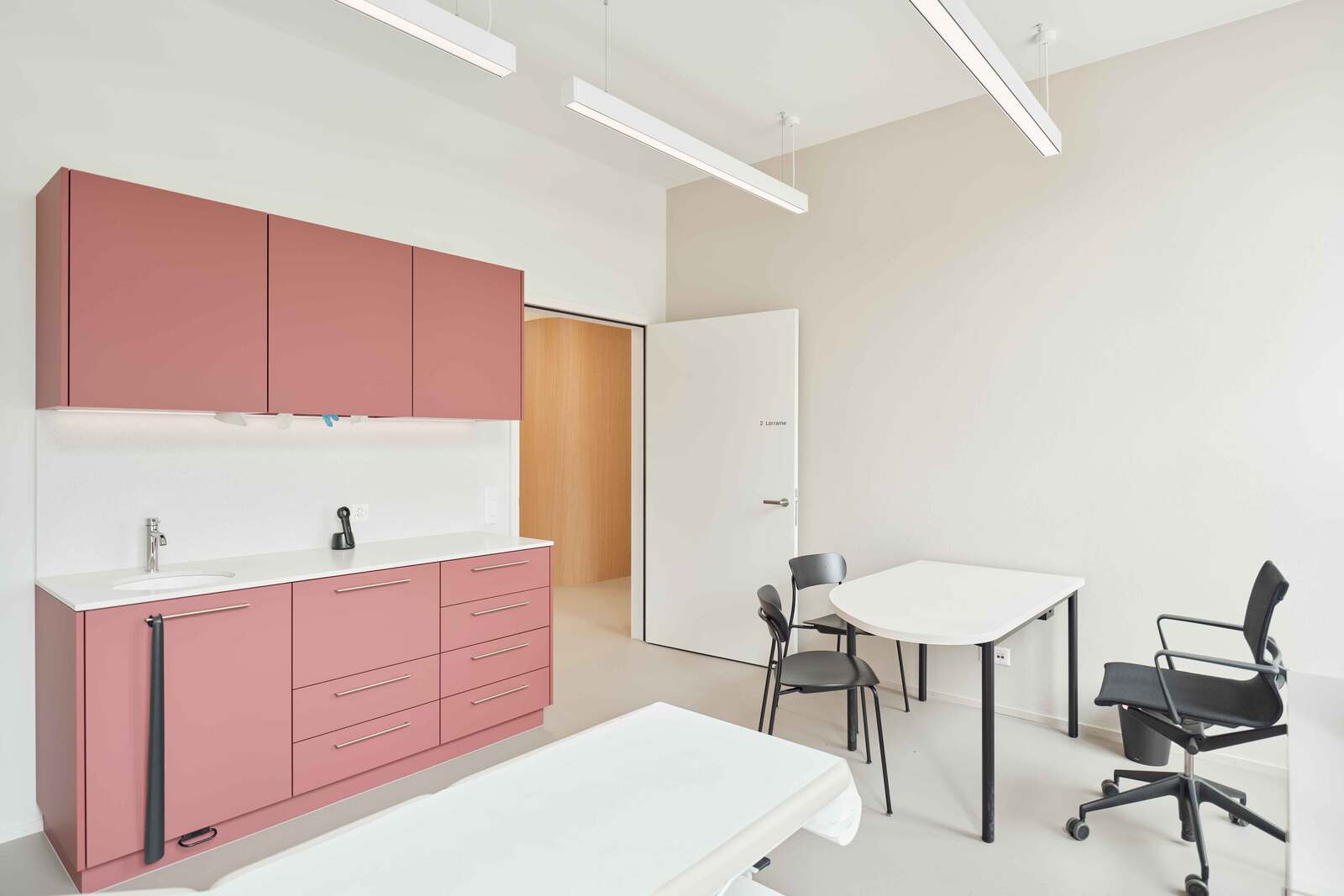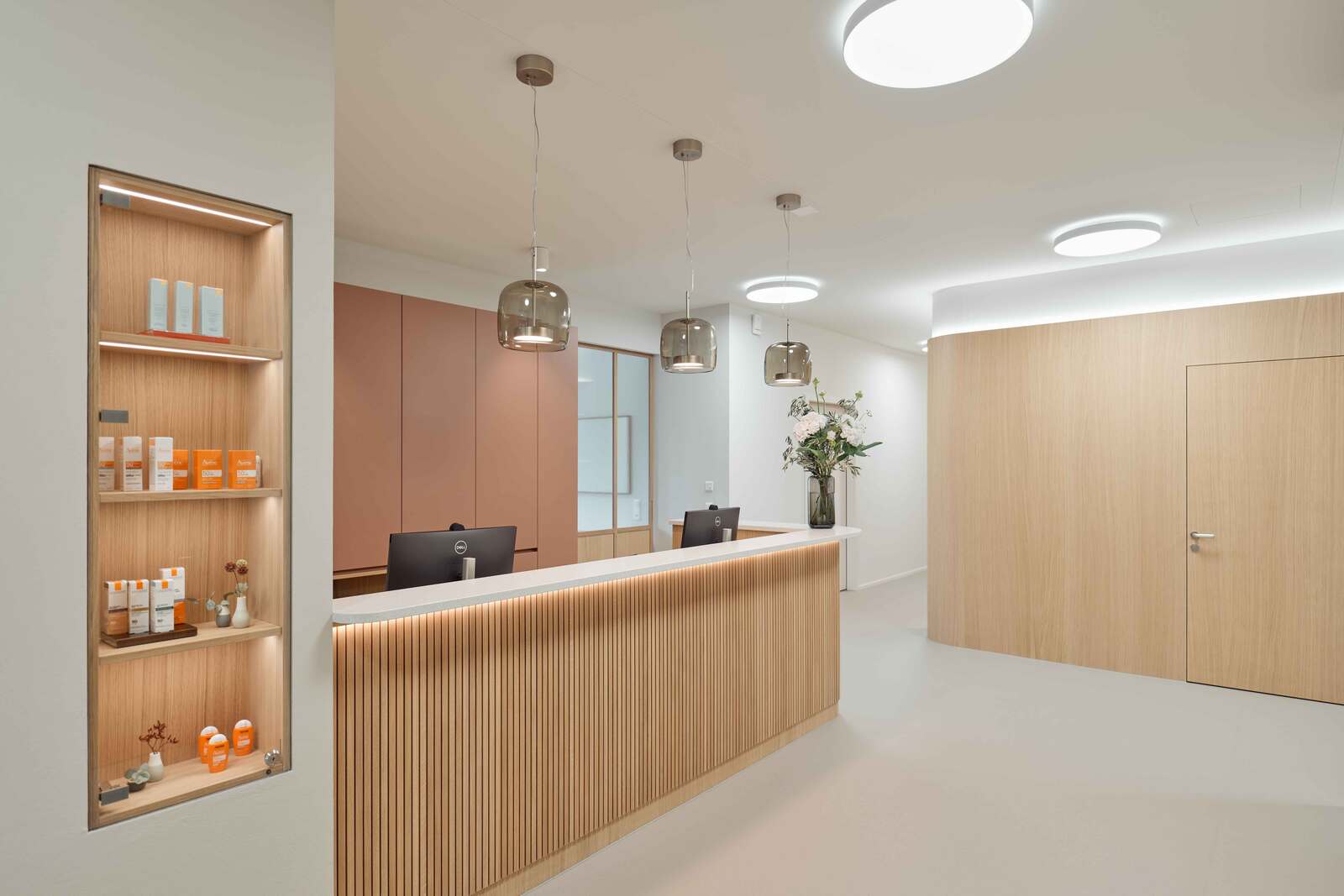 Die Fläche wurde im Edelrohbau übernommen und von der Vogel Design AG in Zusammenarbeit mit den Auftraggeberinnen von der Konzeptentwicklung bis zur Schlüsselübergabe begleitet und realisiert. Behandlungszimmer, Büros, Warte- und Aufenthaltsräume befinden sich bewusst an den lichtdurchfluteten Fassaden der Gewerbefläche, während die Nebenräume, die eine geringere Aufenthaltsdauer erfordern, im Kern des Grundrisses angeordnet sind. Wände, Boden, Decke und Einbaumöbel sind in einem stimmigen Farb- und Materialkonzept harmonisch aufeinander abgestimmt.