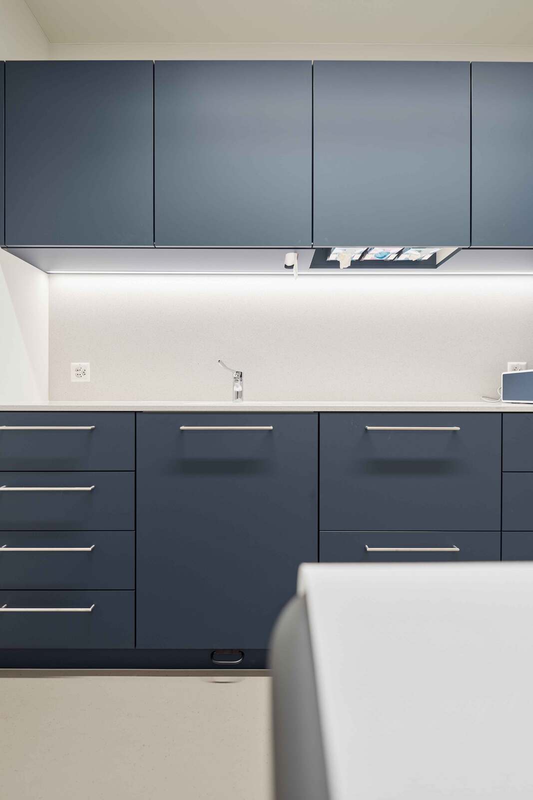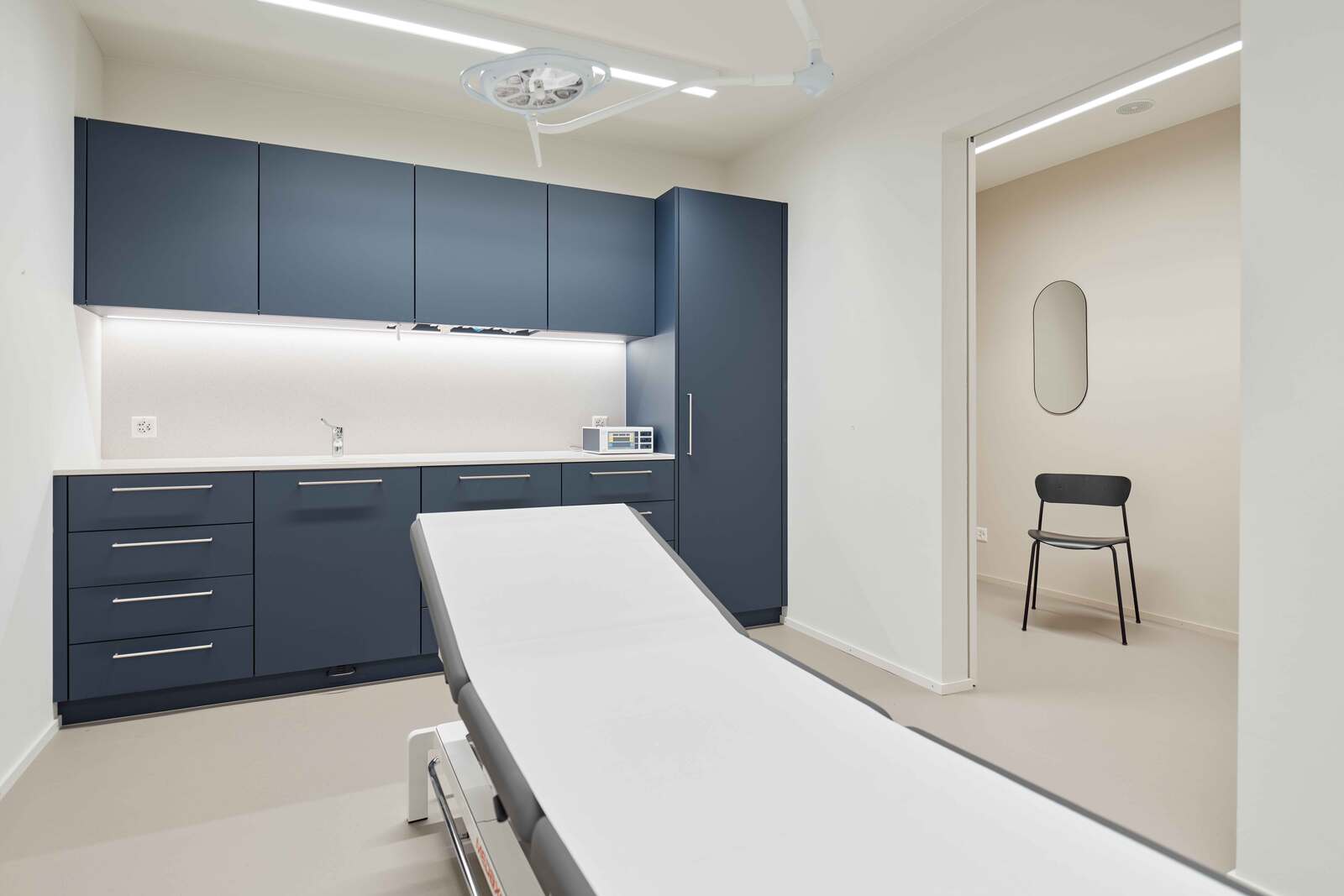 Die Einbaumöbel im OP-Raum mit Schleuse sind wie in den Behandlungszimmern aus mattem Kunstharz gefertigt. Die Kunststeinabdeckung verfügt über ein rundes, integriertes, weiss mattes Waschbecken. Die OP-Leuchte bietet präzises Licht für kleinere Eingriffe.