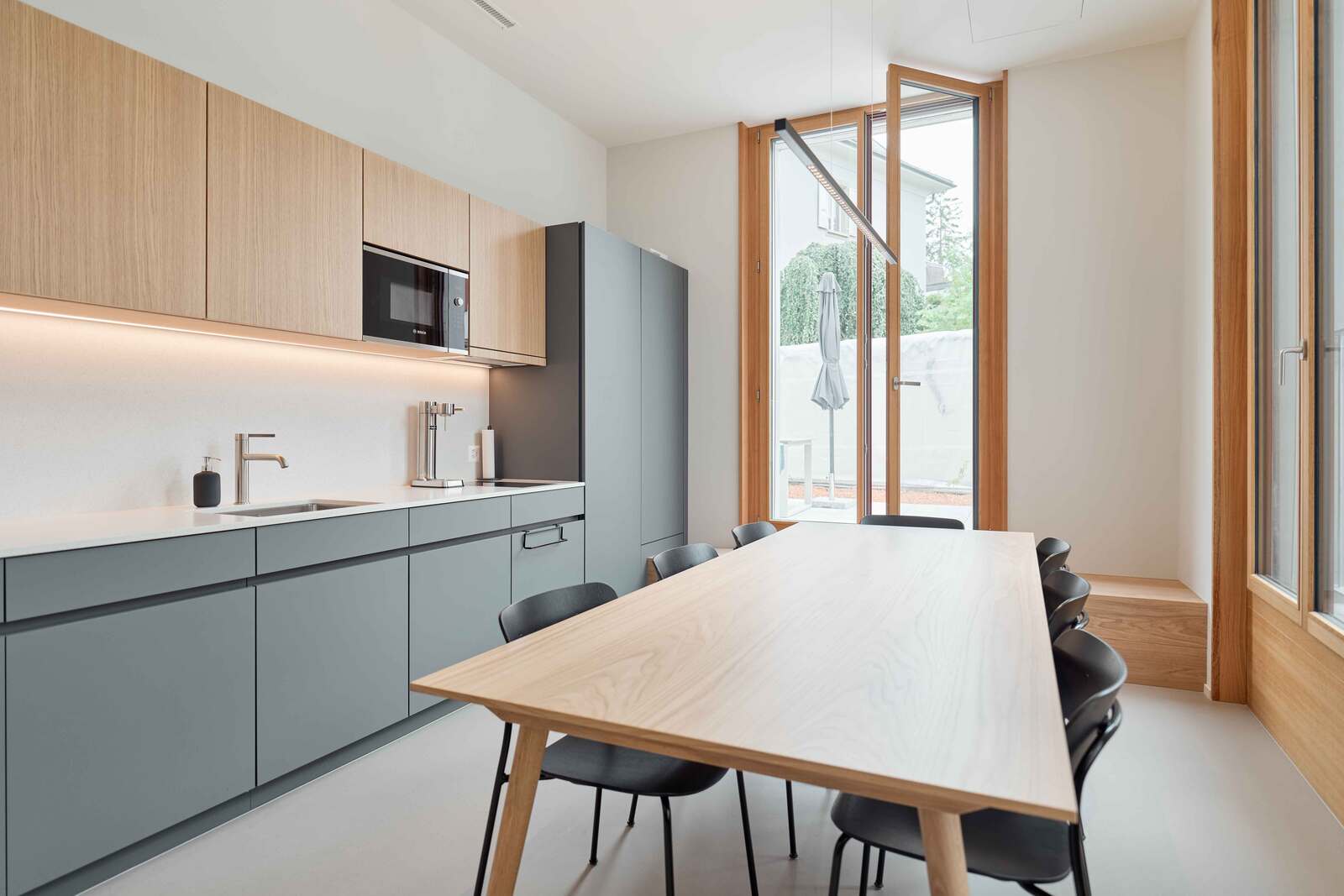 Der lichtdurchflutete Aufenthaltsraum ist mit einer kleinen, aber feinen Küche ausgestattet. Die gemütliche Atmosphäre bietet einen idealen Ort für eine kurze Kaffeepause und dient als Rückzugsort über die Mittagspause. Über ein integriertes Sitz- und Treppenmöbel ist die Terrasse direkt zugänglich.