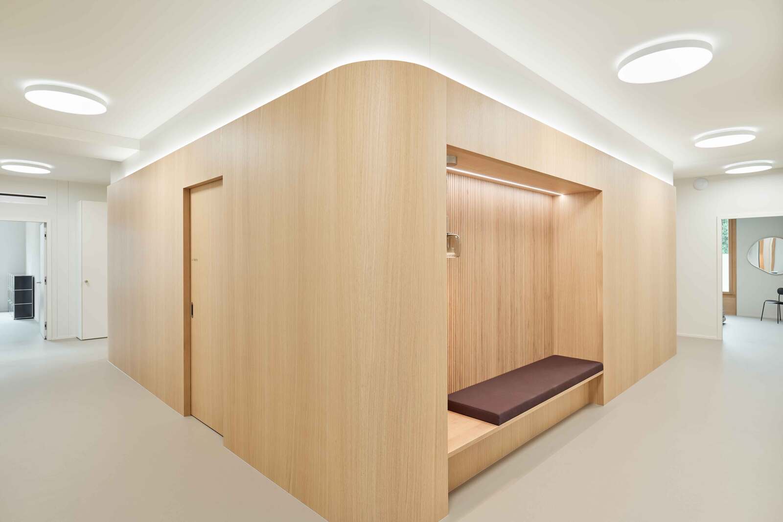 In allen Räumen wurde eine akustische Spanndecke in hellem Schlammton eingesetzt.